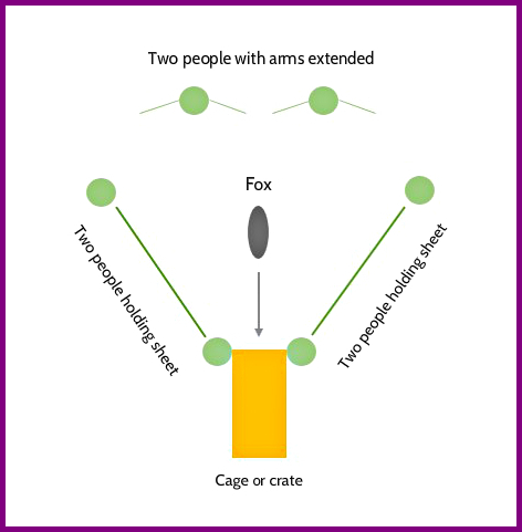 - Foxes jump, so you may wish to create a "sheet roof" between those holding the boards by the crate.
