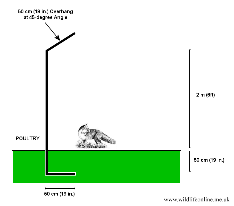 Should a fox escape it's enclosure it is essential that the perimeter fencing of has a suitable "overhang". The overhang needs to be around 2 foot in width and set at a 45 degree angle (cranked fence topper), in order to prevent escape, example here. Foxes are well adapted to jumping and climbing and can quickly and easily clear a 6 foot fence, so fencing must be a minimum of 6 feet in height (from ground level), be solid, secure and preferably be sunken 3 feet into the ground to prevent foxes from digging out.